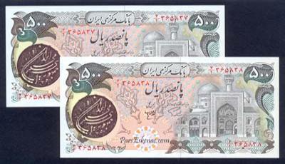 | Banknote>>I R of IRAN Banknotes,اسکناس های جمهوری اسلامی>>P-128 500 Rials first issue of I.R.IRAN, Extra Edge Brown Stamps, UNC Pair |