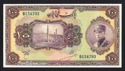 P-28b 100 Rials. XF Condition. Reza Shah Pahlavi with Large Cap Series,Persian Signature. Printed by American Banknote Company.Very Beautiful and Perfect Color.Not Washed, Not Pressed,Not Repaired,Very Strong Paper. Printed at 1313 H.S. 1934.Extremely Rare Specific in High Condition.